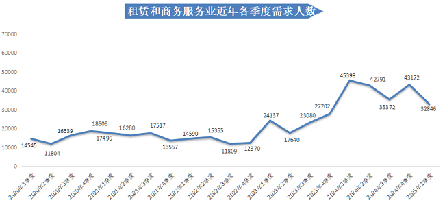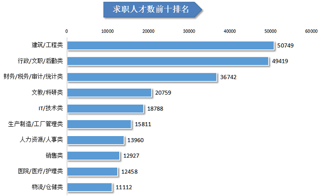 在行业分布中,人才需求量排名前五的行业类别分别为:租赁和商务服务业、制造业、信息传输/计算机服务和软件业、建筑业、教育业,这五个行业合计需求人才数占比达到76.65%。