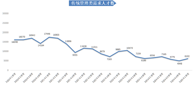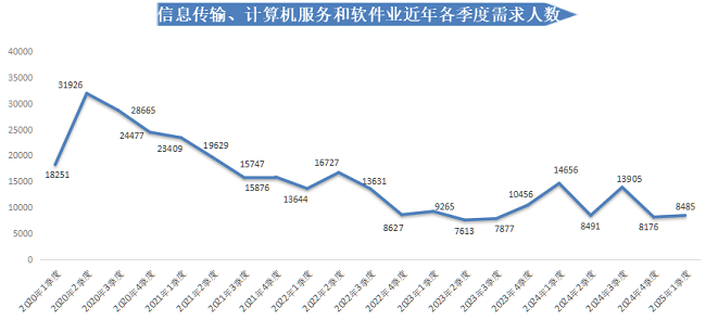 24个主要行业类别中,有将近六成行业类别的人才需求相较于上年同期出现不同程度的下滑。其中,需求减少主要集中在租赁与商务服务业、信息传输/计算机服务和软件业中,租赁与商务服务业的需求人才数比上年同期减少12553人,同比下滑27.65%,是本季度人才需求量同比减少最多的行业类别;信息传输/计算机服务和软件业的需求人才数比上年同期减少6171人,同比下滑42.11%。