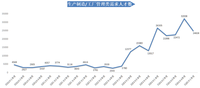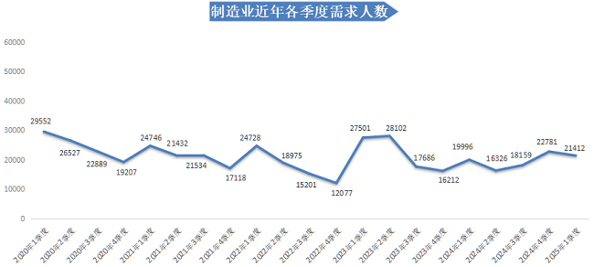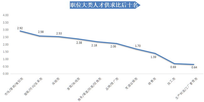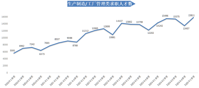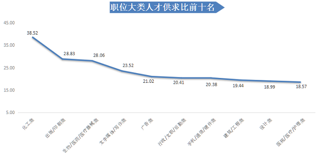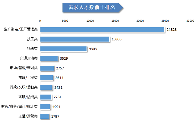 另外,有10个行业类别的人才需求相较于上年同期实现不同程度的增长。制造业的人才需求增长量排名第一,需求人才数比上年同期增加1416人,同比增长7.08%。