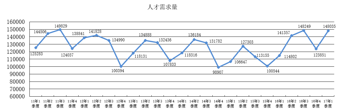 2017年第一季度,通过广西人才网联系统招聘人才的用人单位共11404家,与上年同期相比上涨10.88%。2017年第一季度人才需求量达到148035人,同比涨幅达到28.95%,达到近六年来的一季度最高值。