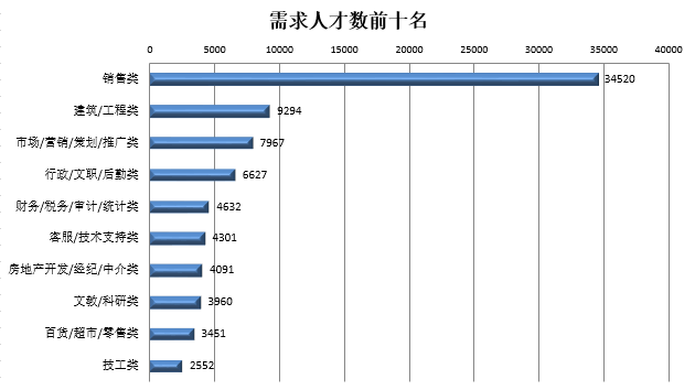 1.位居需求榜前十名的职位:销售类、建筑/工程类、市场/营销/策划/推广类、行政/文职/后勤类、财务/税务/审计/统计类、客服/技术支持类、房地产开发/经纪/中介类、文教/科研类、百货/超市/零售类及技工类等职位类型。这十个职位类型的需求人才数总计81395人,占人才总需求量的54.98%,其中销售类职位需求长期以绝对优势位居首位,其需求人才数达到34520人,比上年同期增加6621人,大幅增长23.73%。