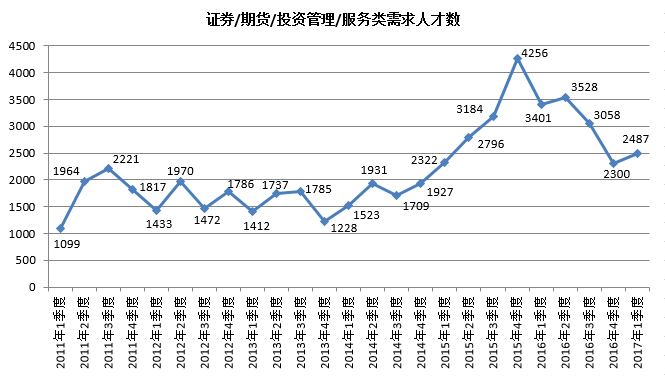 2017年第一季度,广西人才网联系统中证券/期货/投资管理/服务类职位人才需求量为2487人,与上年同期的2487人相比减少914人,同比大幅下降26.87%。其中,投资/理财顾问和投资顾问/基金经理这两大职位与上年同期相比分别减少了514人和329人,降幅高达32.91%和52.14%。
