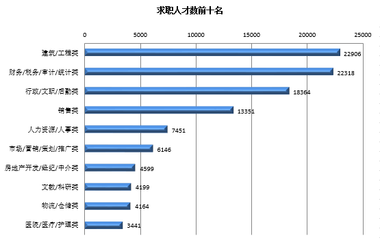 1.位居求职榜前十名的职位:建筑/工程类、财务/税务/审计/统计类、行政/文职/后勤类、销售类、人力资源/人事类、市场/营销/策划/推广类、房地产开发/经纪/中介类、文教/科研类、物流/仓储类及医院/医疗/护理类等职位类型。这十个职位类型求职人才数量总计106939人,占总求职人才数55.79%。其中,建筑/工程类、财务/税务/审计/统计类及行政/文职/后勤类这三类职位类型求职人才数位居前三位,均超过18000人。