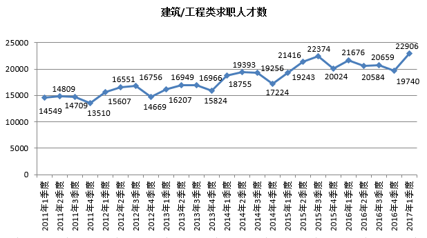 2017年第一季度,广西人才网联系统中建筑/工程类职位的人才供应持续增长,其求职人才数为22906人,与上年同期相比增长1230人,同比小幅增长5.67%,环比涨幅为16.04%,创历史新高。
