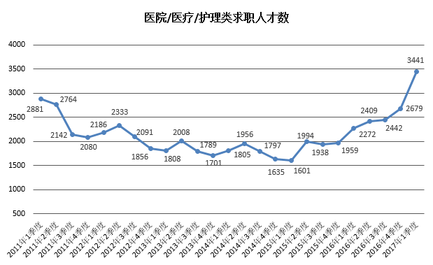 2017年一季度,医院/医疗/护理类职位的求职人才数本季度达到历年最高值,求职人才数为3441人,与上年同期相比增加1169人,同比涨幅高达51.45%。其中,护士/护理人员和药库主任/药剂师分别比上年同期分别增加269人和44人,涨幅分别达到129.33%和49.44%。