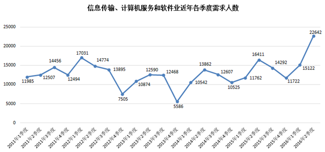 2、信息传输、计算机服务和软件业人才需求量达到22642人,首创历年各季度新高,与去年同期的16411人相比增加6231人,同比涨幅达到37.97%;