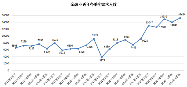 3、金融业人才需求量一路走高,其人才需求量达到15221人,首次突破15000大关,与去年同期的13047人相比增加6231人,同比增长16.66%;