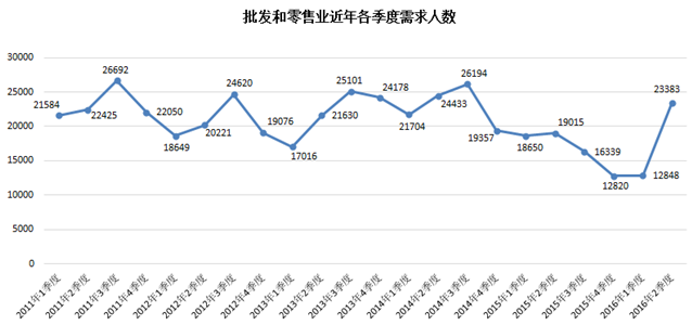 4、贸易/进出口行业的复苏带动整个批发和零售业人才需求量强势反弹,其人才需求量达到23383人,同比大幅增长22.97%,环比涨幅高达82.00%,跃居本季度行业人才需求量榜首。