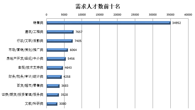 1、位居需求榜前十名的职位:销售类、建筑/工程类、行政/文职/后勤类、市场/营销/策划/推广类、房地产开发/经纪/中介类、客服/技术支持类、财务/税务/审计/统计类、百货/超市/零售类、证券/期货/投资管理/服务类及文教/科研类等职位类型。这十个职位类型的需求人才数总计80726人,占人才总需求量的57.11%,其中销售类职位需求长期以绝对优势位居首位,其需求人才数达到34952人,该职位类型人才需求量首次超过3万人,占比分别达到24.73%。