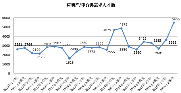 2、房地产开发/经纪/中介类职位人才需求量达到5456人,创历史新高,与去年同期的3422人相比增加2034人,增幅达到59.44%,成为本季度需求增长量最大的职位类型;