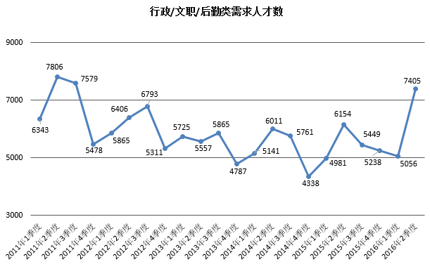 3、行政/文职/后勤类职位人才需求重新回升至7千人平台,其人才需求量达到7405人,同比增加了1251人,增幅高达20.33%;
