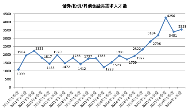 2016年二季度,广西人才网联系统中证券/金融/投资类职位人才需求继续维持较高水平,其人才需求量达到3528人,与去年同期相比增加732人,同比涨幅达到26.18%。