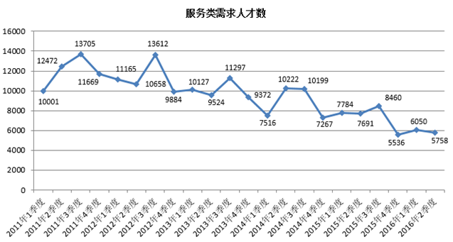 2016年二季度,广西人才网联系统中服务类职位总需求仅为5758人,同比降幅达到25.13%。其中百货/连锁/超市/零售类、餐饮/娱乐类及美容/保健类职位需求量分别为3683人、1587人和488人,比去年同期相比分别减少1192人、443人和298人,同比降幅分别达到24.45%、21.82%和37.91%。