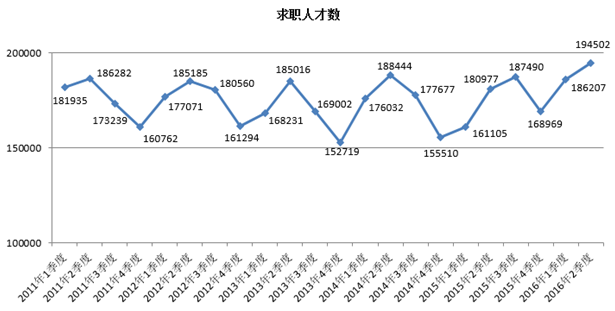 2016年二季度,广西人才网联系统的求职人才数达到194502人,历史首次突破19万人大关,比去年同期增长了7.47%。