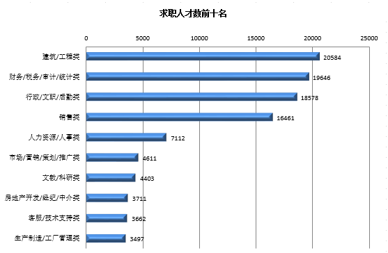1、位居求职榜前十名的职位:建筑/工程类、财务/税务/审计/统计类、行政/文职/后勤类、销售类、人力资源/人事类、市场/营销/策划/推广类、文教/科研类、房地产开发/经纪/中介类、客服/技术支持类及生产制造/工厂管理类等职位类型。这十个职位类型求职人才数量总计102265人,其中,建筑/工程类、财务/税务/审计/统计类及行政/文职/后勤类这三类职位类型求职人才数以绝对优势位居前三位,均超过18000人;