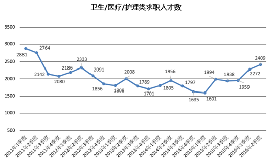 2016年二季度,医院/医疗/护理类职位的求职人才数为2409人,与去年同期相比增加415人,同比增长20.81%。其中护士/护理人员类职位求职人才数为279人,同比涨幅高达60.34%。