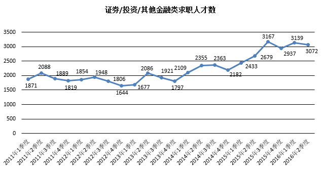 2016年二季度,广西人才网联系统中证券/金融/投资类职位的人才供应量为3072人,总体人才供应比上季度回落2.13%,但是其与去年同期相比仍增加393人,同比增长14.67%。