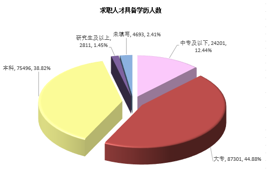 4、大专和本科学历仍是广西人才网联系统的求职人才的主力军,其求职人才数占比分别为44.88%和38.82%,大专和本科学历的求职人才共计162797人,比去年同期的152819人增加了9978人,同比增长6.53%。