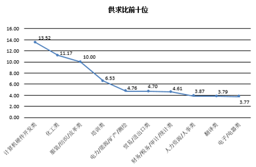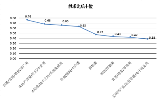 其中,由于需求很少,计算机硬件开发类、化工类及服装/纺织/皮革类等职位竞争激烈,其供求比分别高达13.52、11.17及10.00,位居供求比前三位;而互联网产品/运营管理/电子商务类、百货/超市/零售类及美容/保健类等职位需求人才较多,而求职人才数相对较少,其供求比分别仅为0.38、0.42及0.43,位居供求比后三位,其中互联网产品/运营管理/电子商务类职位由于人才需求增长太快,目前人才已经不能满足市场需求,其人才供求比首次跌到榜尾。