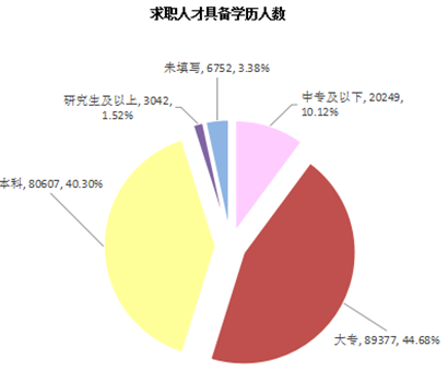 7. 广西人才网联系统求职人才学历长期集中在大专和本科学历,其求职人才数占比分别为44.68%和40.30%,大专和本科学历的求职人才共计169984人,与上年同期的161729人相比增加8255人,小幅增长5.10%。