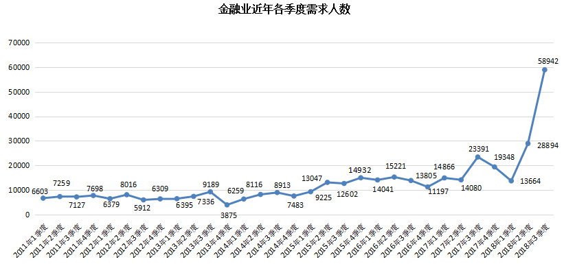 4. 金融业人才需求突破性增长,达到58942人,与去年同期的23391人相比增加35551人,同比涨幅高达151.99%。