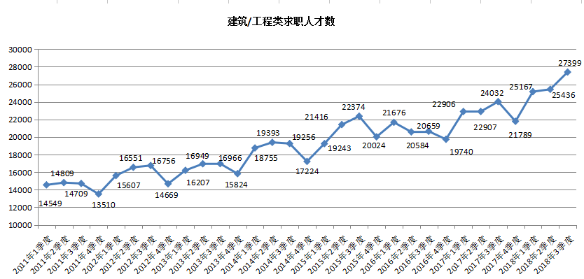 2. 建筑/工程类职位的求职人才数为27399人,创历史新高,与去年同期相比增长3367人,同比涨幅为14.01%。