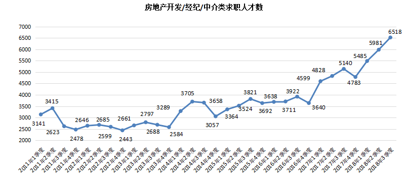 2018年第三季度,广西人才网联系统中房地产开发/经纪/中介类职位的人才供应量创历史新高,其求职人才数为6518人,与上年同期相比增加1378人,同比涨幅达到26.81%。