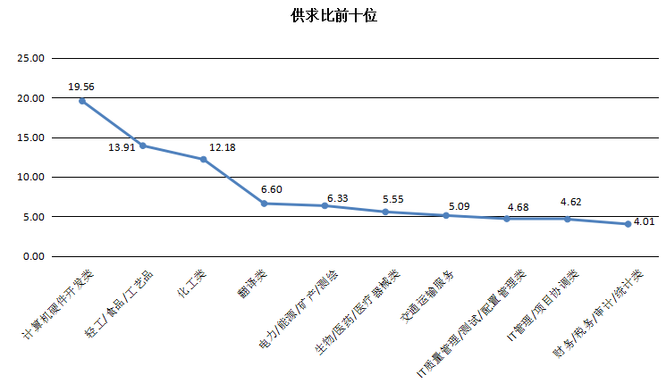 其中,由于需求极少,计算机硬件开发类、轻工/食品/工艺品类及化工类职位就业竞争压力较大,其供求比分别高达19.56、13.91及12.18,位居供求比前三位;而服务业三类职位和销售类等职位由于人员流动性大等特征,需求长期旺盛,供求比长期位居供求比后十位,其合计供求比分别仅为0.51和0.21。