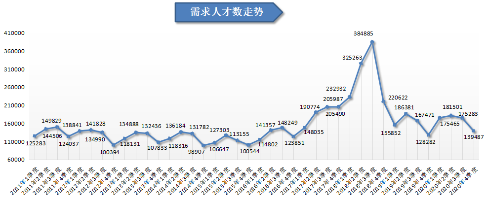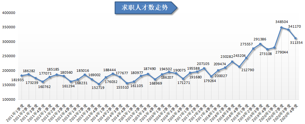 在人才供给方面,求职人才数同比大幅增长,在2020年第四季度达到311354人,比上年同期增加38246人,同比增长14.00%,比人才需求的增幅高出5.27个百分点。