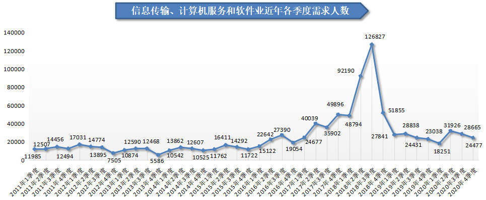 2.信息传输/计算机服务和软件业需求人才数位居榜首,达到24477人,与上年同期的23038人相比,增加了1439人,同比增长6.25%。其中,计算机软件行业、互联网行业人才需求增长较大,这两个行业的需求人才数分别为4247人和6966人,比上年同期分别增加2818人和2646人,同比涨幅分别达到197.20%和61.25%。