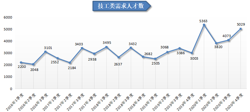 2.技工类职位需求人才数为5029人,与上年同期相比增加2026人,同比大幅增长67.47%。其中普工/杂工是技工类职位人才需求的主要增长点,其需求人数为1720人,比去年同期增加1108人,同比涨幅达到181.05%。