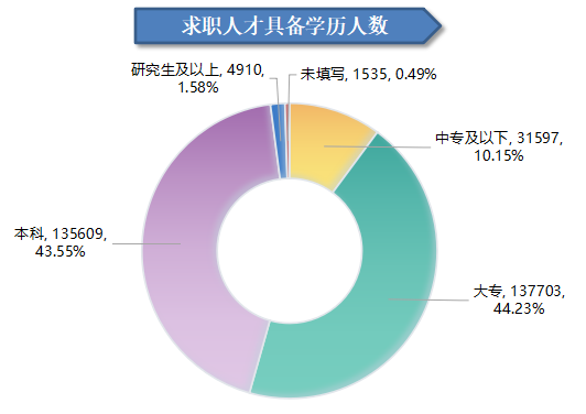 2020年第四季度,广西人才网求职人才学历长期集中在大专和本科学历,其中大专学历求职人才数占比高达44.23%,本科学历求职人才数占比达43.55%,大专和本科学历的求职人才共计273312人,与上年同期的238529人相比增加34783人,同比增长14.58%。