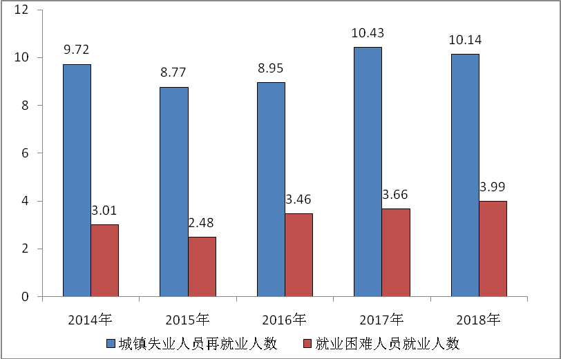 图3 近五年城镇失业人员再就业及就业困难人员就业人数