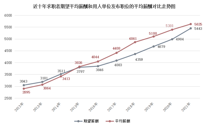 近十年求职者期望平均薪酬和用人单位发布职位的平均薪酬对比走势图如下: