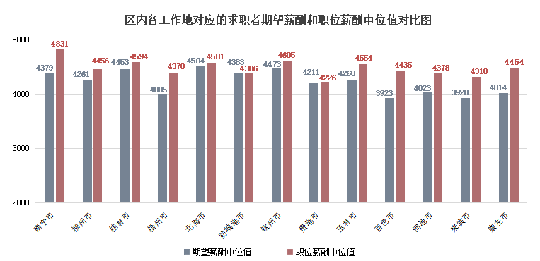 广西人才网中各工作地对应的求职者期望薪酬和职位薪酬中位值如下表(单位:元/月):