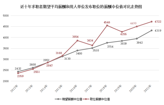 近十年求职者期望薪酬和用人单位发布职位薪酬中位值对比走势图如下: