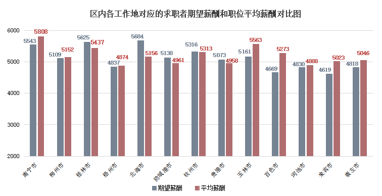 广西人才网中各工作地对应的求职者期望薪酬和职位平均薪酬如下图(单位:元/月):