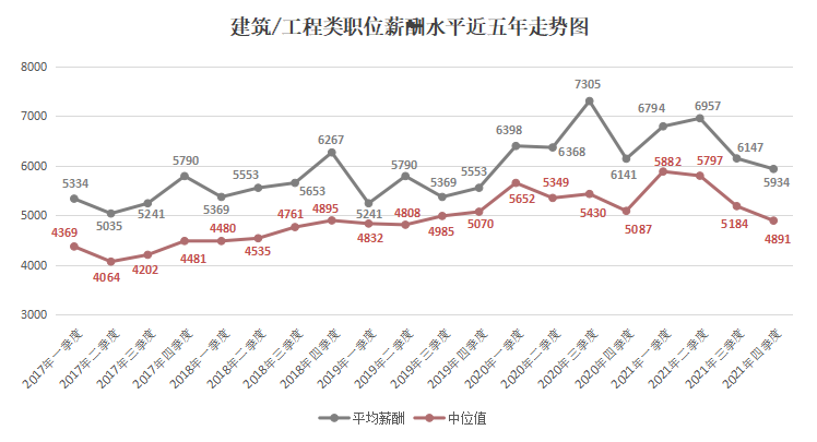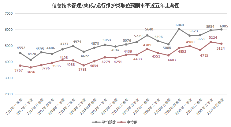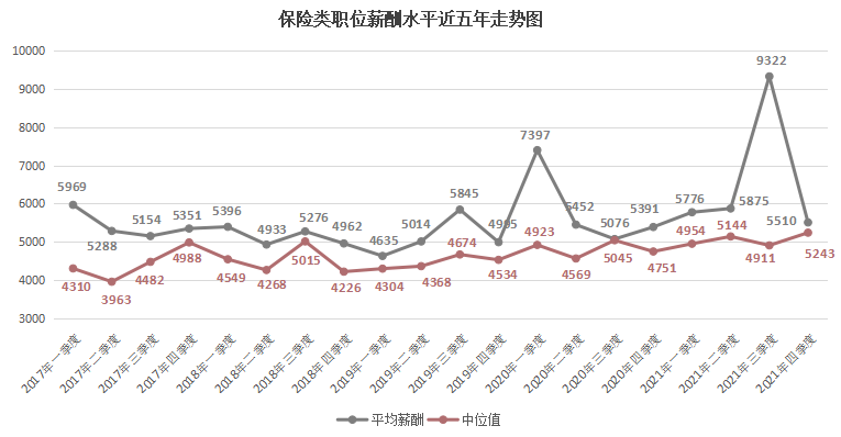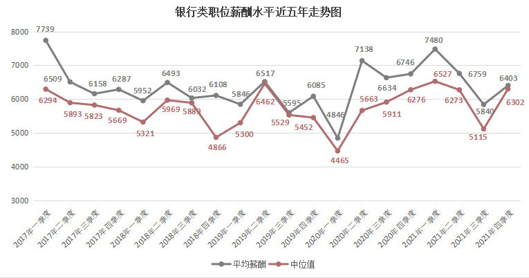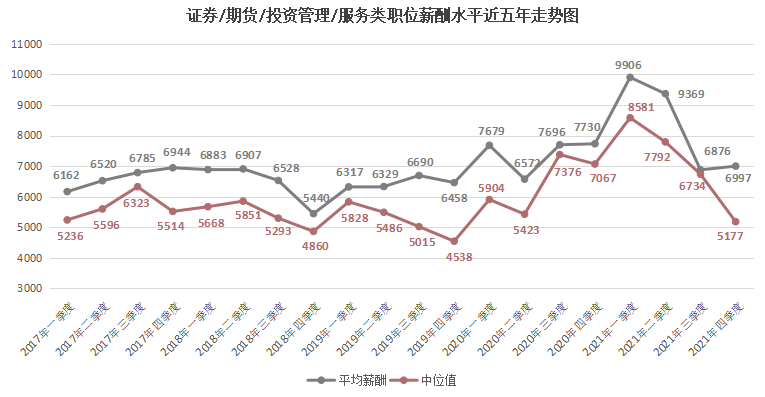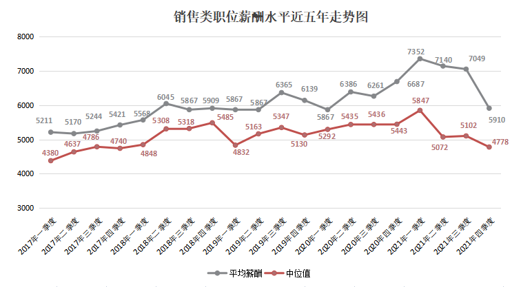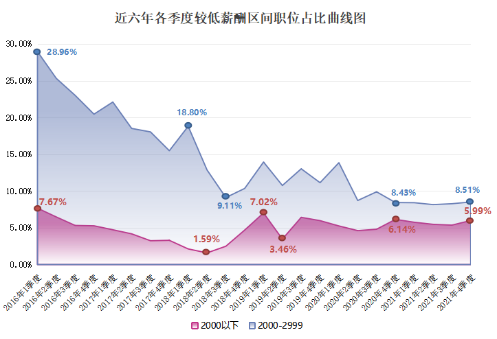 由上图可见,近六年2000元/月以下和2000-2999元/月较低薪酬区间呈现整体下滑趋势,2021年第四季度职位数量占比仅为5.99%和8.51%。