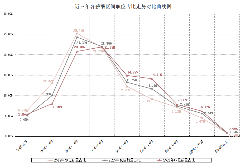 如上图所示,近三年来曲线后移较为明显,职位平均薪酬水平呈现逐年增长趋势,平均薪酬水平已由2019年的5100元/月增长为本年度的5625元/月,涨幅达到10.29%。低薪职位占比逐年下滑,其中2000-2999元/月区间的职位数量比例呈现了较为明显的下降趋势,其职位数量占比由2019年的13.02%下降到本年度的8.01%,减少5.01个百分点;中等薪酬职位占比依旧是人才网的主流薪酬区间,其中3000-3999元/月区间职位占比为20.78%,比2020年减少3.51个百分点;4000-4999元/月区间职位占比为21.89%,虽比2020年微减0.07个百分点,但成为本年度最为集中的薪酬区间;5000-5999元/月区间职位占比为14.89%,比2020年增加1.65个百分点。高薪职位占比逐年走高,本年度6000以上元/月薪酬区间职位均创新高。其中,6000-7999元/月区间职位占比为14.11%,比2020年增加2.50个百分点;8000-9999元/月区间职位占比为7.80%,比2020年增加0.39个百分点;10000以上元/月区间职位合计占比为7.13%,比2020年增加0.68个百分点。