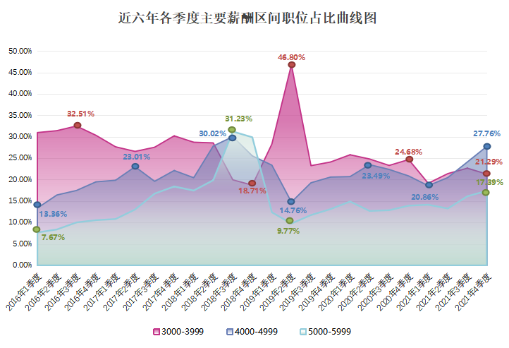 近六年各季度主要薪酬区间(单位:元/月)的职位数量占比曲线图如下: