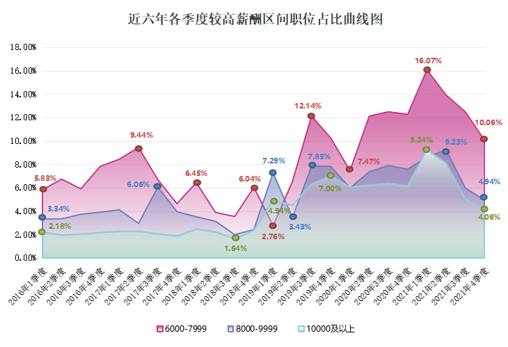 近六年各季度较高薪酬区间(单位:元/月)的职位数量占比曲线图如下: