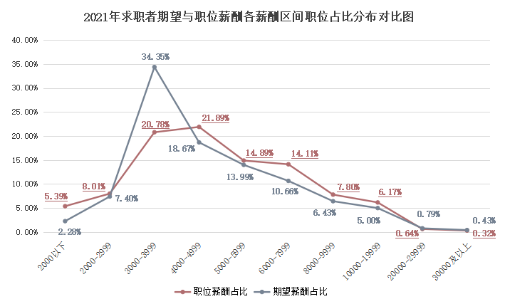 2021年求职者期望与职位薪酬(各薪酬区间分布)对比曲线图: