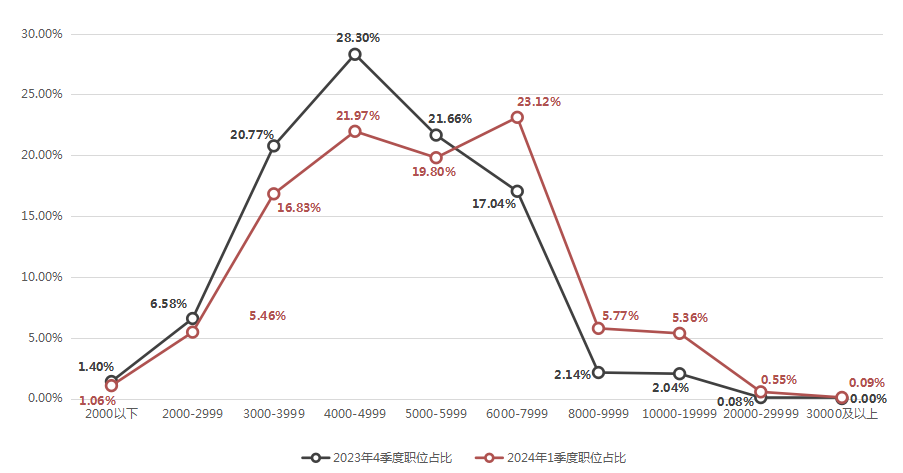 2024年第一季度,求职者期望的薪酬区间占比保持平稳,整体呈现出正偏态分布的特征,主要集中在3000-3999元/月区间,该区间的求职者期望薪酬占比达到24.33%。