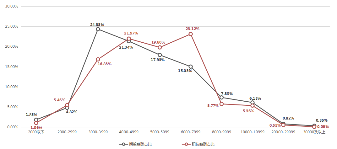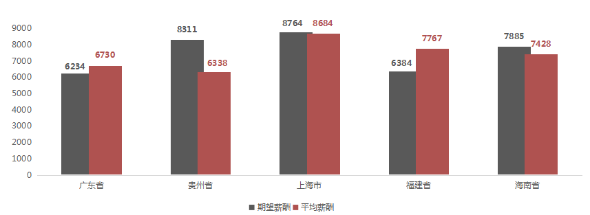 4:职位平均薪酬指的是所属职位类别中用人单位发布职位的薪酬样本加权平均值,不代表单个职位的实际薪酬,例如高级管理类职位平均薪酬为10798/月,但其有很多副总以上级别的高薪职位薪酬更高。期望薪酬指的是求职者期望从事职位类别的薪酬样本加权平均值。