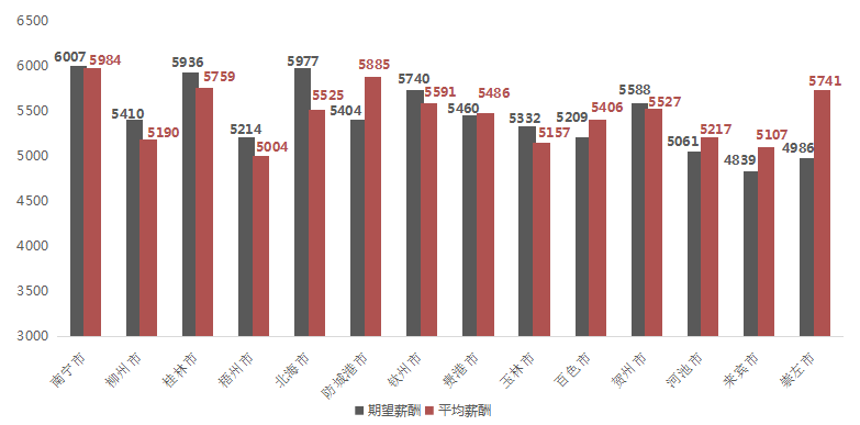 广西人才网中区内主要工作地对应的求职者期望薪酬和职位平均薪酬水平分布图如下(单位:元/月):