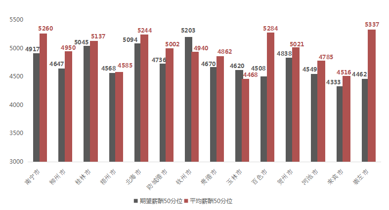 广西人才网中区内主要工作地对应的求职者期望薪酬中位值和职位平均薪酬中位值水平分布图如下(单位:元/月):