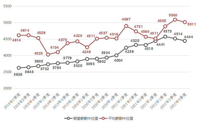 近五年求职者期望薪酬中位值和用人单位发布职位薪酬中位值对比走势图如下: