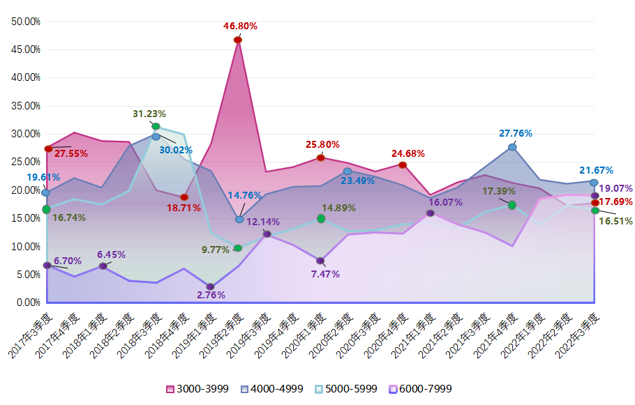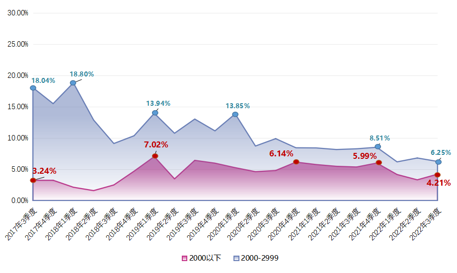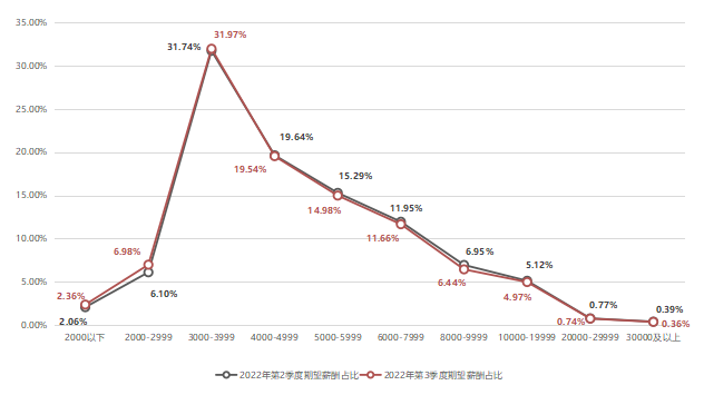 2022年第三季度,求职者期望薪酬整体变化波动明显。其中,3000-3999元/月区间集中了31.97%的求职者,与上季度相比,该区间求职者期望薪酬占比基本持平,占比环比增长0.23个百分点;而从4000-30000以上元/月所有区间的求职者期望薪酬占比呈现微跌态势,合计占比环比下滑1.42个百分点。