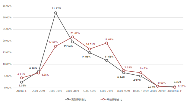 注4:职位平均薪酬指的是所属职位类别中用人单位发布职位的薪酬样本加权平均值,不代表单个职位的实际薪酬,例如高级管理类职位平均薪酬为15687元/月,但其中有很多副总以上级别的高薪职位薪酬更高。期望薪酬指的是求职者期望从事职位类别的薪酬样本加权平均值。
