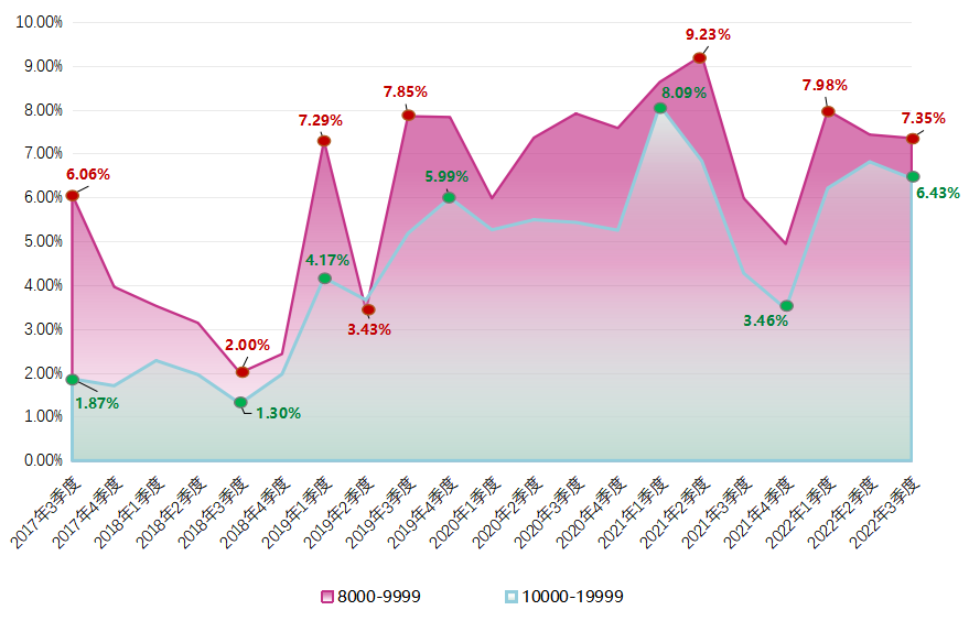本季度职位薪酬区间占比主要集中在4000-4999元/月区间,占比达到21.67%,与上季度相比,该区间职位占比呈现增长态势,占比环比增长0.54个百分点。3000-3999元/月占比为17.69%,占比环比增长0.46个百分点。而5000-5999元/月和6000-7999元/月两个区间职位占比均呈现不同程度的下滑,环比分别下降0.77和0.09个百分点;8000-9999元/月区间占比为7.35%,环比微跌0.08个百分点;10000-19999元/月区间占比为6.43%,环比下滑0.38个百分点;20000以上元/月区间合计占比为0.82%,环比下跌0.03个百分点。